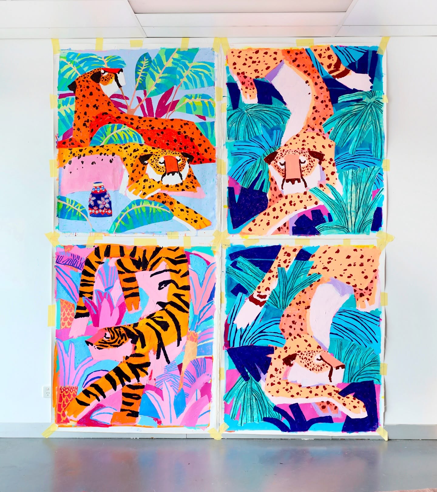 Mia, creates striking representations of animals in tropical and otherworldly settings, drawing inspiration from various cultural archives.
