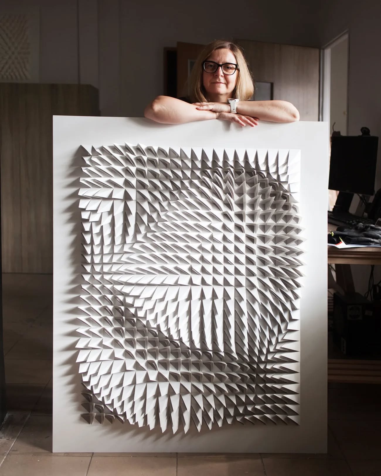 Anna Kruhelska creates abstract, three-dimensional paper wall reliefs that transform with light and perspective. Her work is deeply influenced by minimalism, geometry, and architectural composition, resulting in crisp, white-on-white framed installations.