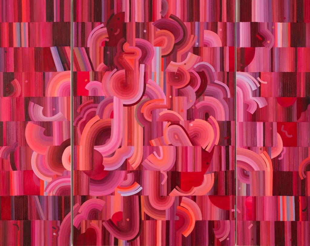 Ilana explains that her paintings involve math and reflections on society. She selects texts representing harm in society, particularly legal documents with exclusionary language, and transforms them into paintings.